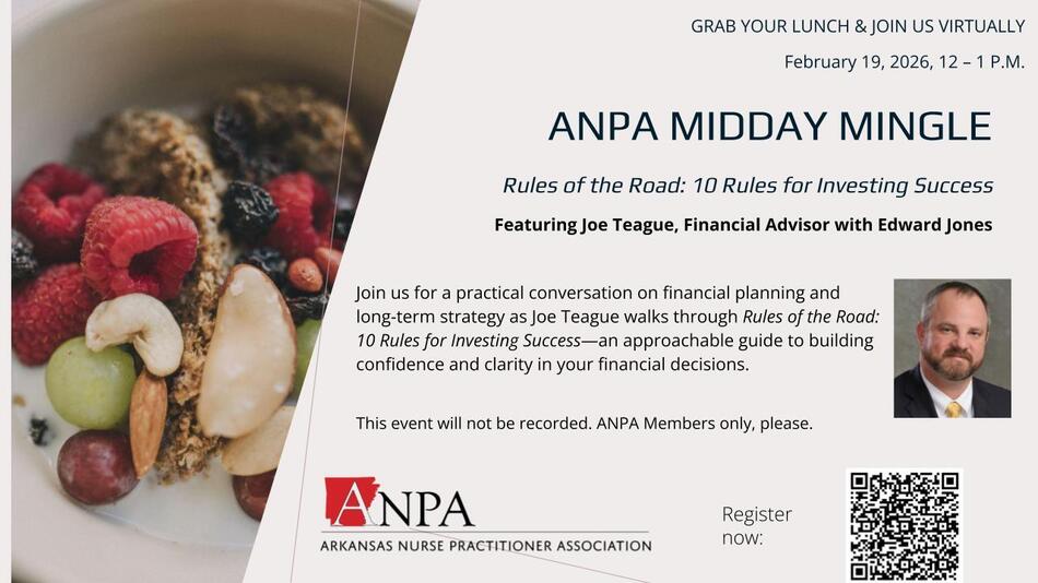 Join us for a lunch-hour Midday Mingle with Joe Teague, Financial Advisor with Edward Jones, for an informative discussion focused on financial planning and practical strategies for NPs.