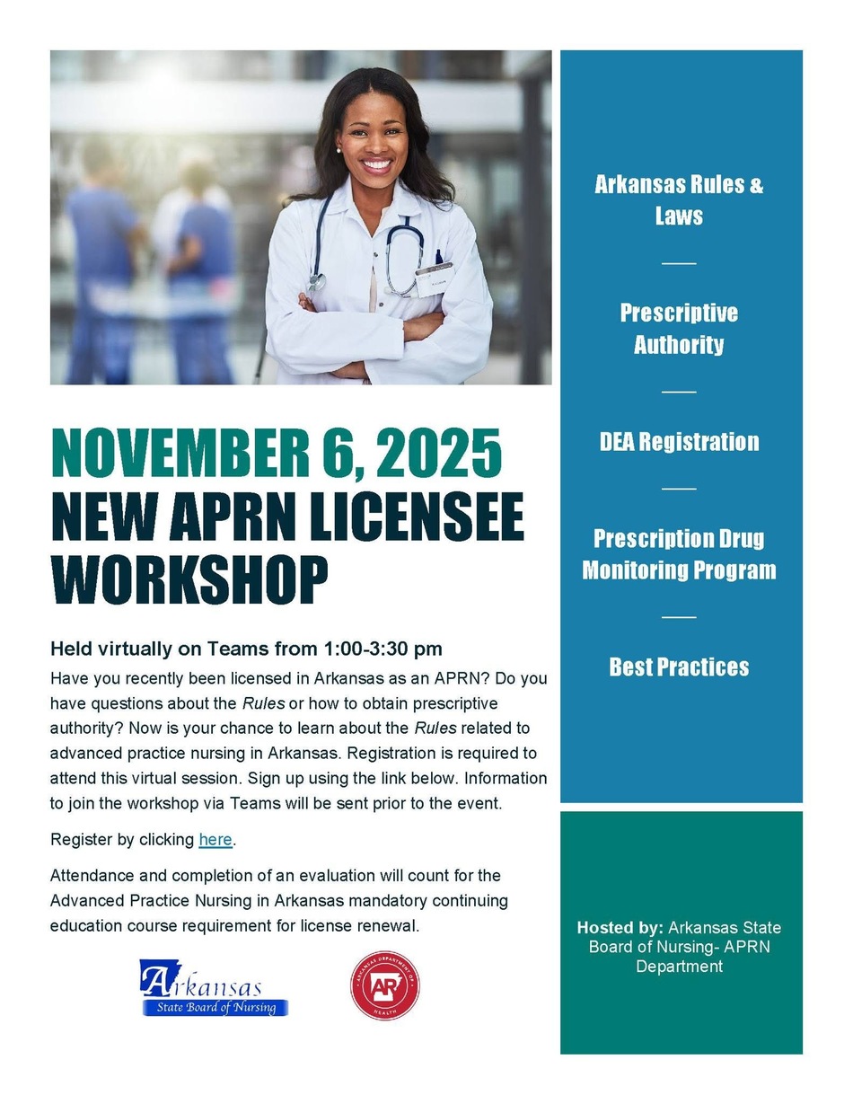 The Arkansas State Board of Nursing is hosting a free virtual APRN license workshop on Teams from 1:00-3:30 pm, November 6