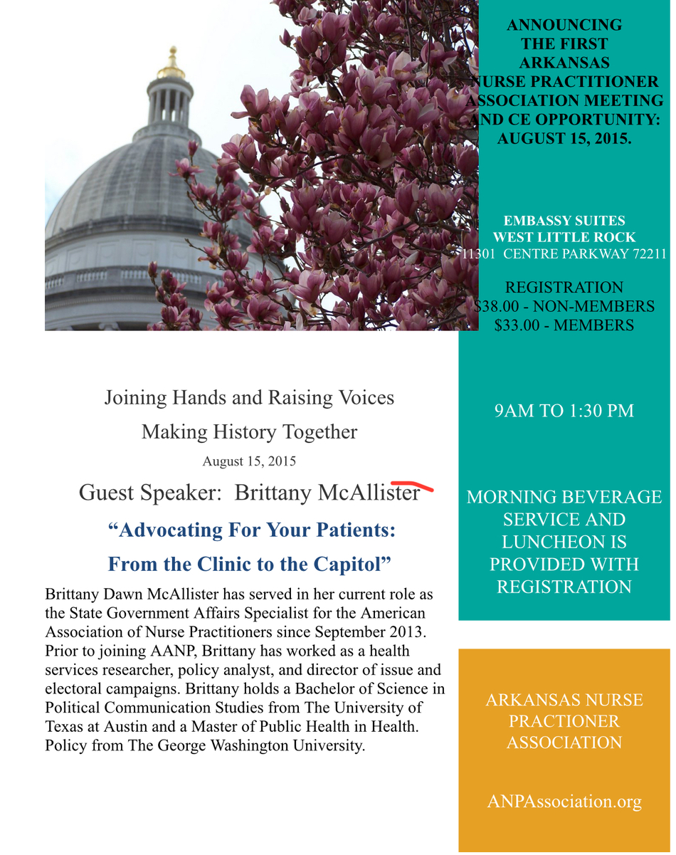 In 2014, the Arkansas Nurse Practitioner Association (ANPA )was established to unite, support, educate, and enhance the professional identity of Nurse Practitioners in Arkansas, while promoting and advocating for excellence in practice. The first ANPA conference was held in August 2015.