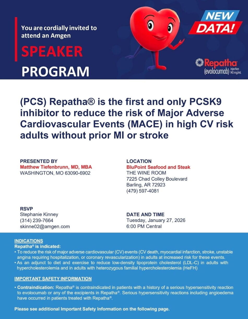 You are invited to attend an Amgen Speaker Program featuring new data on Repatha® (evolocumab).